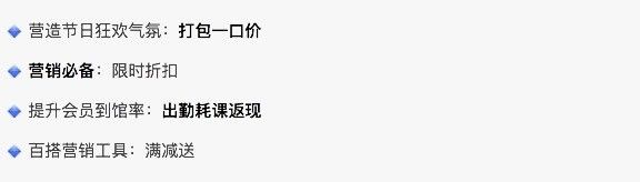 通过限时折扣,健身房可选择一种或多种课程,一种或多种会员卡,在一段时间内此种课程或会员卡以指定的折扣出售,以更优的价格吸引会员,产生更多的消费。