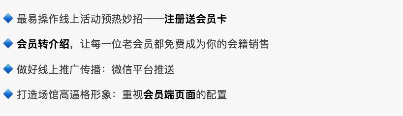 当有用户线上注册为健身房会员时,场馆可设置自动为新用户发放体验卡,为其提供约课便利,同时可以尽可能多的引流线上用户到场馆体验,并转化为会员。