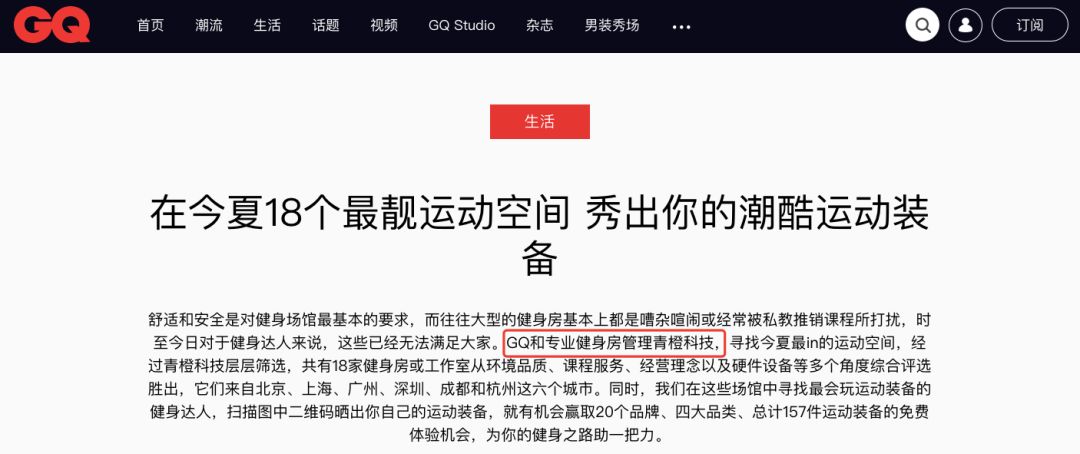 (青橙科技联合国内顶级男刊杂志GQ为青橙用户场馆做宣传)